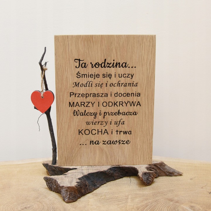 Drewniana tabliczka z grawerem – "Ta rodzina śmieje się i uczy..."Tabliczka z grawerem – Serce Twojego Domu