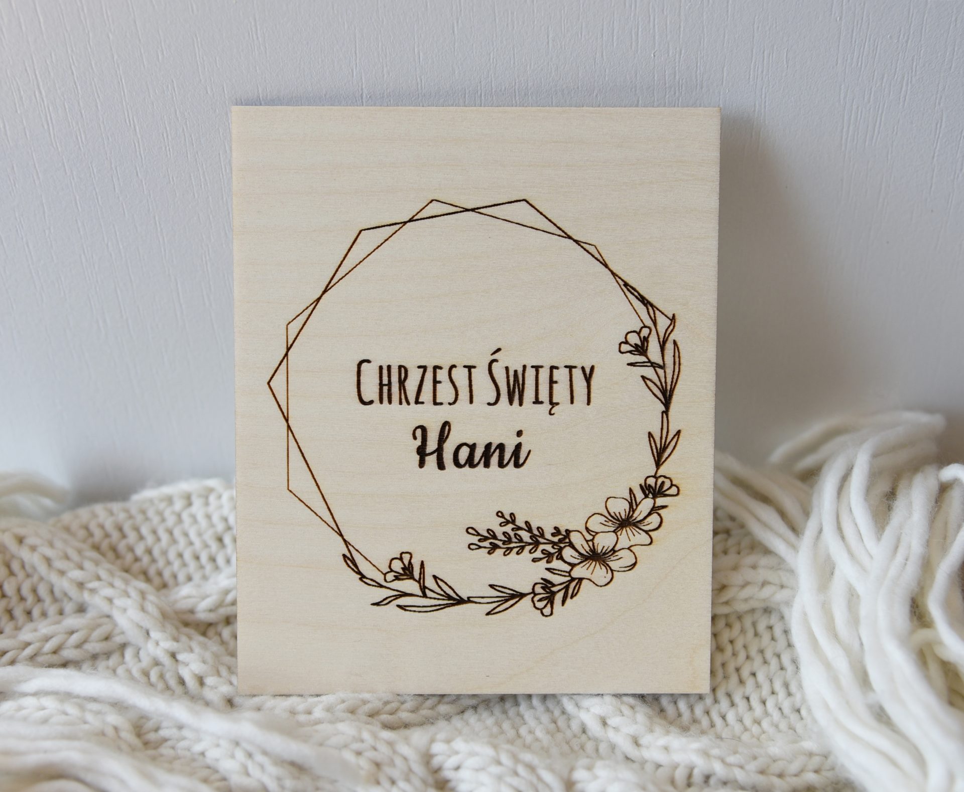 Drewniana tabliczka z dwustronnym grawerem. Na pierwszej stronie mieści się wianuszek z kwiatkami i napisem Chrzest Święty oraz dowolne imię dziecka. Na drugiej stronie znajduje się piękny wierszyk oraz dowolna dedykacja. Taka tabliczka to nie tylko piękny i oryginalny prezent ale również pamiątka na wiele lat.