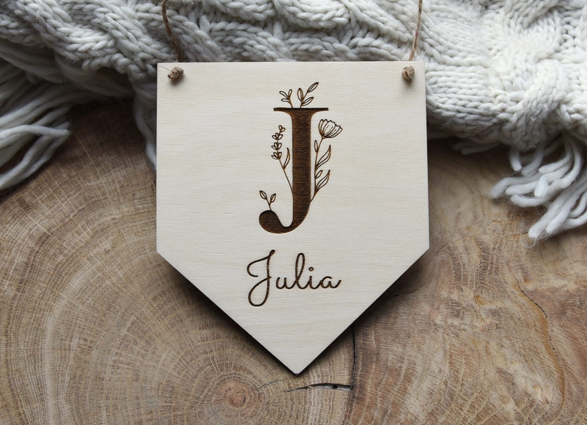 Drewniana tabliczka zawieszka proporczyk z piękną wygrawerowaną dekoracyjną literką oraz imieniem