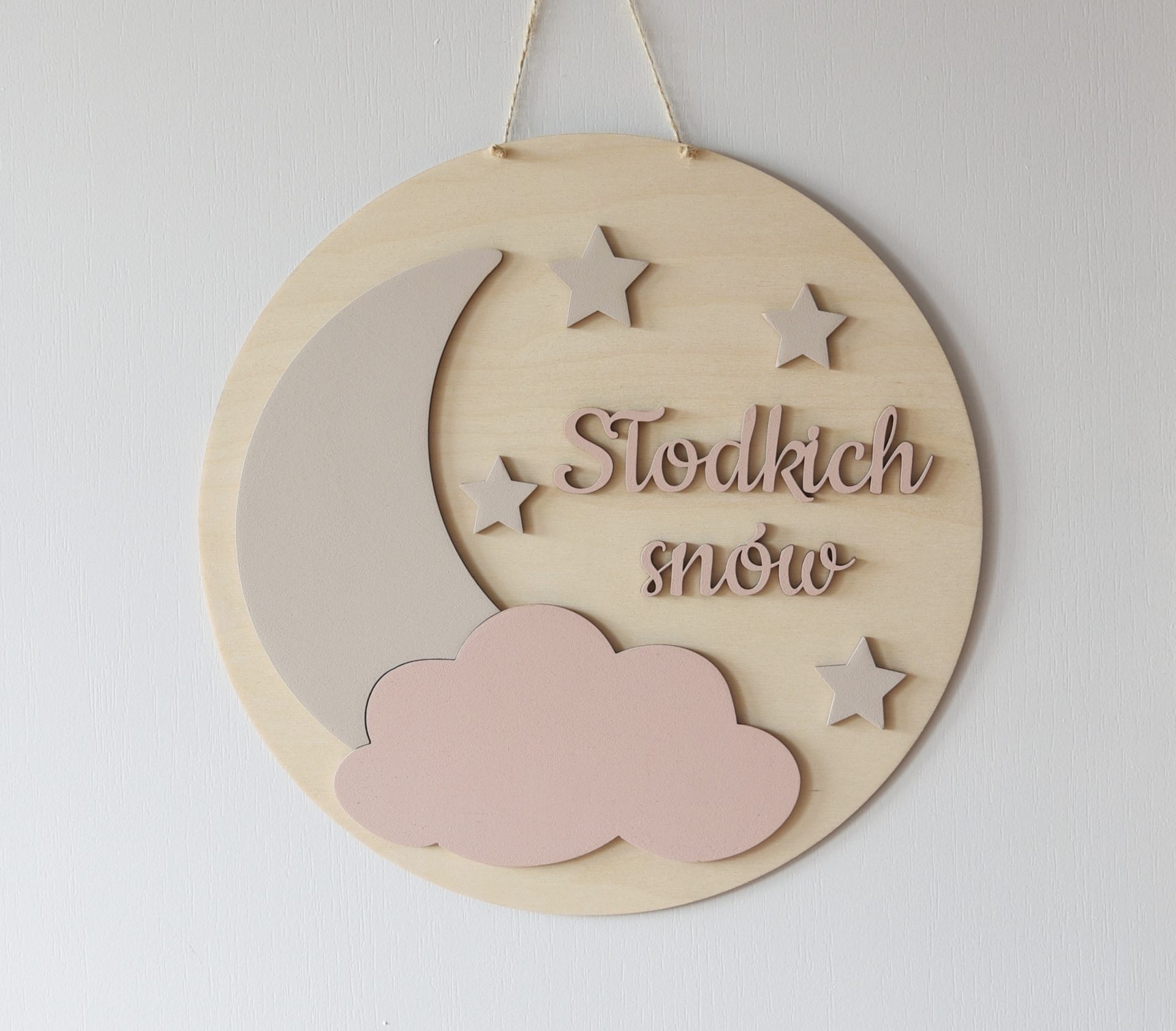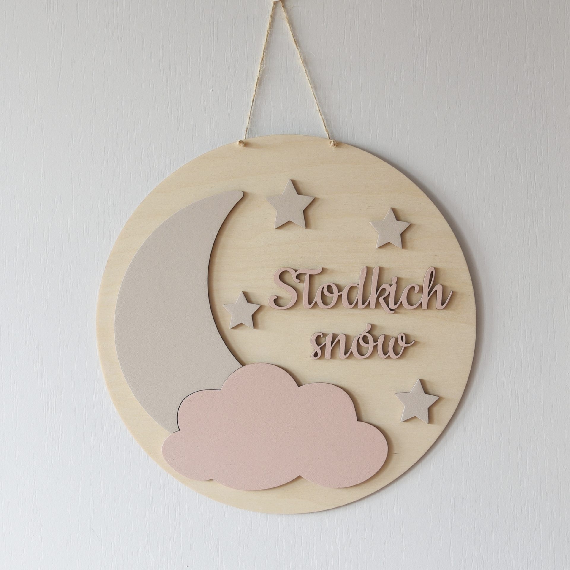Drewniana tabliczka z napisem Słodkich Snów  to subtelna dekoracja, która dopełni wystrój w pokoju dziecka i doda mu odrobinę wdzięku. Dzięki tej uroczej ozdobie, pokój Twojego dziecka zyska cudowny przytulny charakter. Pięknie zaprezentuje się podczas sesji zdjęciowych, a także zostanie piękną pamiątką na długie lata. Drewnianą tabliczkę wykonaliśmy ze sklejki w kolorze naturalnym oraz pomalowaliśmy na różowo chmurkę i napis Słodkich snów, a na beżowo gwiazdki i księżyc.   Wszystkie przedmioty są malowane ręcznie, więc mogą się od siebie nieznacznie różnić. PRODUKT NA ZAMÓWIENIE! CZAS REALIZACJI 2 DNI ROBOCZE.   Wymiary tabliczki: 29cm x 29cm Materiał:
