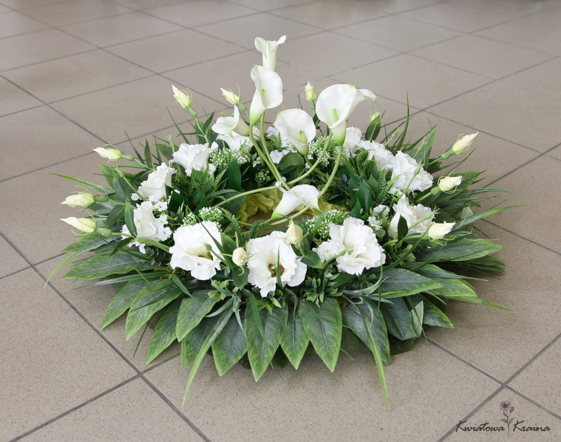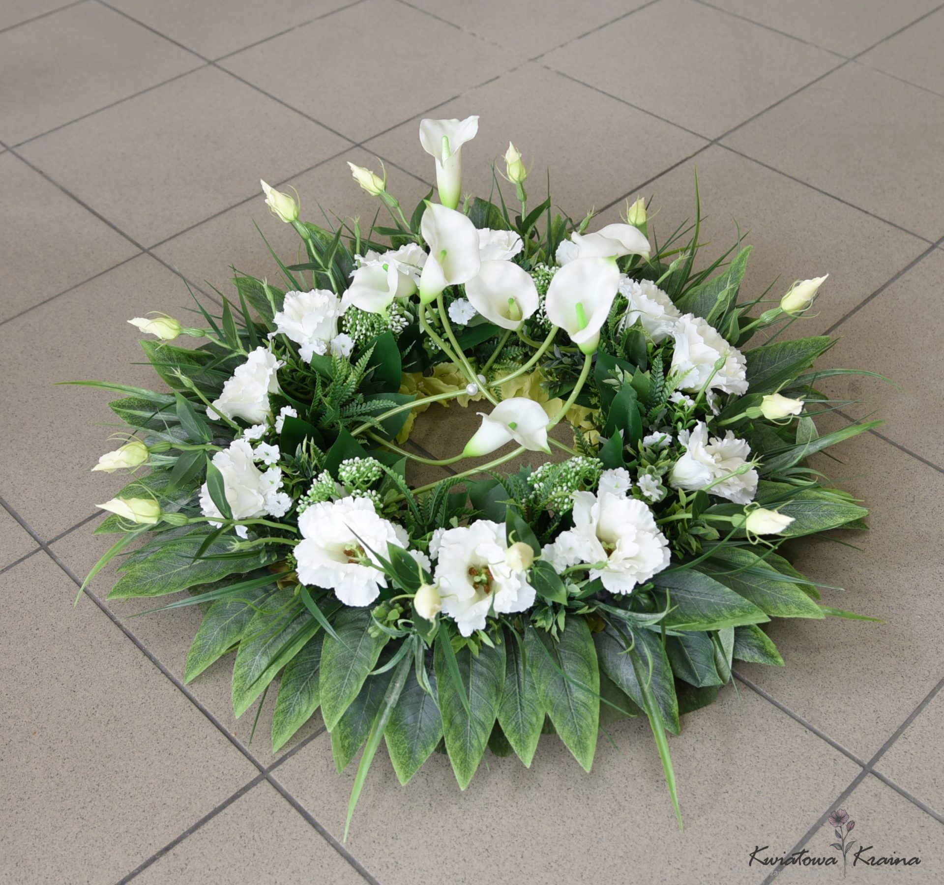 Urokliwa dekoracja nagrobna  w kształcie koła które tworzą misternie ułożone kwiaty eustomy nadając lekkości i zwiewności. W kompozycji dominują stonowane odcienie zieleni i bieli. W centrum dekoracji umieszczone zostały finezyjnie ułożone kwiaty kali które dodają szlachetności. Tylko odbiór osobisty.