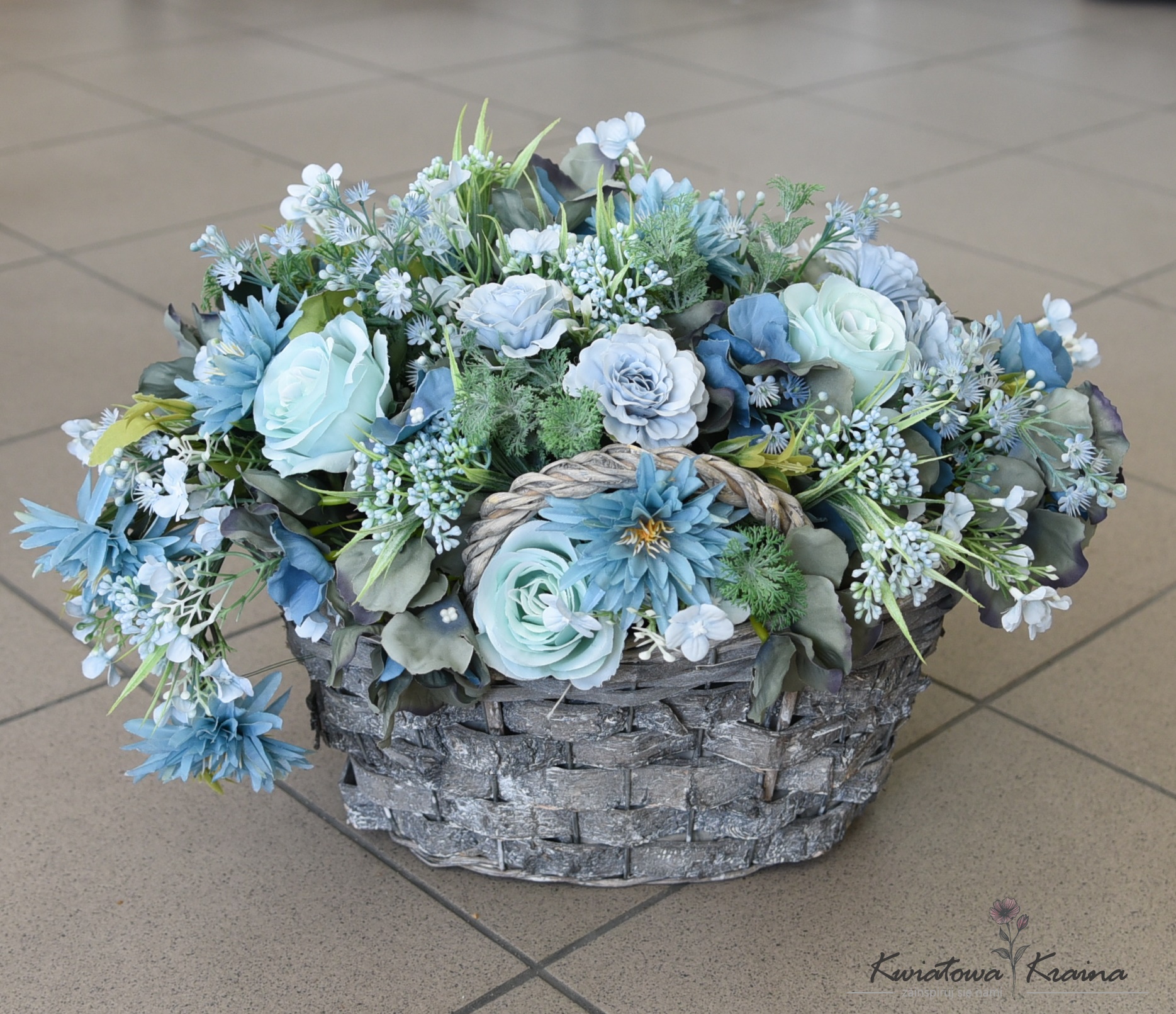Kompozycja kwiatowa w szarym koszyczku ze starannie dobranymi kolorystycznie jak i jakościowo kwiatami w kolorze mięty oraz niebieskiego wraz z przydymionymi dodatkami tworzą piękną spójną całość. Tylko odbiór osobistySpecyfikacja