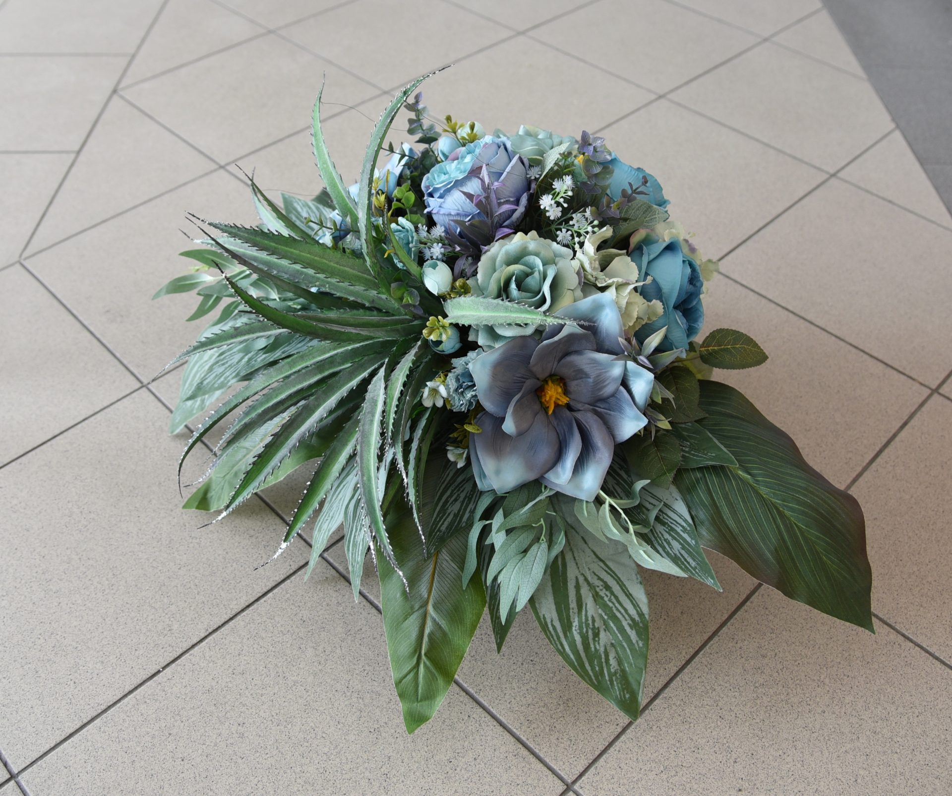 Kompozycja kwiatowa w pięknie dobranych ze sobą kolorach niebieskiego oraz mięty. Całość otoczona liśćmi w zgaszonych odcieniach zieleni. Na uwagę zasługuje tutaj charakterny duży kwiat aloesu który niewątpliwie dodaje oryginalnego charakteru. Tylko odbiór osobisty!