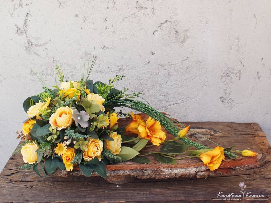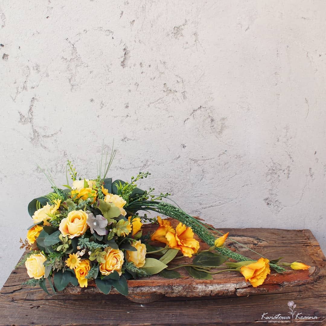 Niebywale ciekawym elementem w tej kompozycji jest duży płat kory dębowej na którym ułożone są kwiaty o dość żywej kolorystyce i wyszukanej formie. Doskonały kolaż barw. Tylko odbiór osobistySpecyfikacja