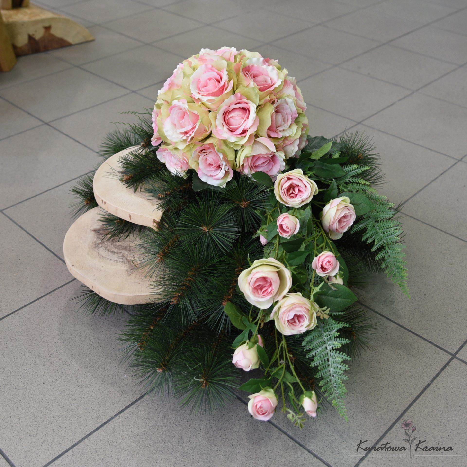 Bardzo oryginalna w swojej formie kompozycja funeralna. Kwiatowa kula wyklejona jasno różowymi różyczkami oraz finezyjnie wypływające z niej gałązki róż w tym samym odcieniu świetnie współgrają z zielenią żyłkowego sosnowego podkładu który stanowi bazę tej dekoracji. Zarówno kwiaty jak i sosnowy podkład są najwyższej jakości do złudzenia przypominając żywe. Świetnym naturalnym dodatkiem który dodaje niepowtarzalnego charakteru są 2 ułożone piętrowo kawałki drewna. Tylko odbiór osobisty.