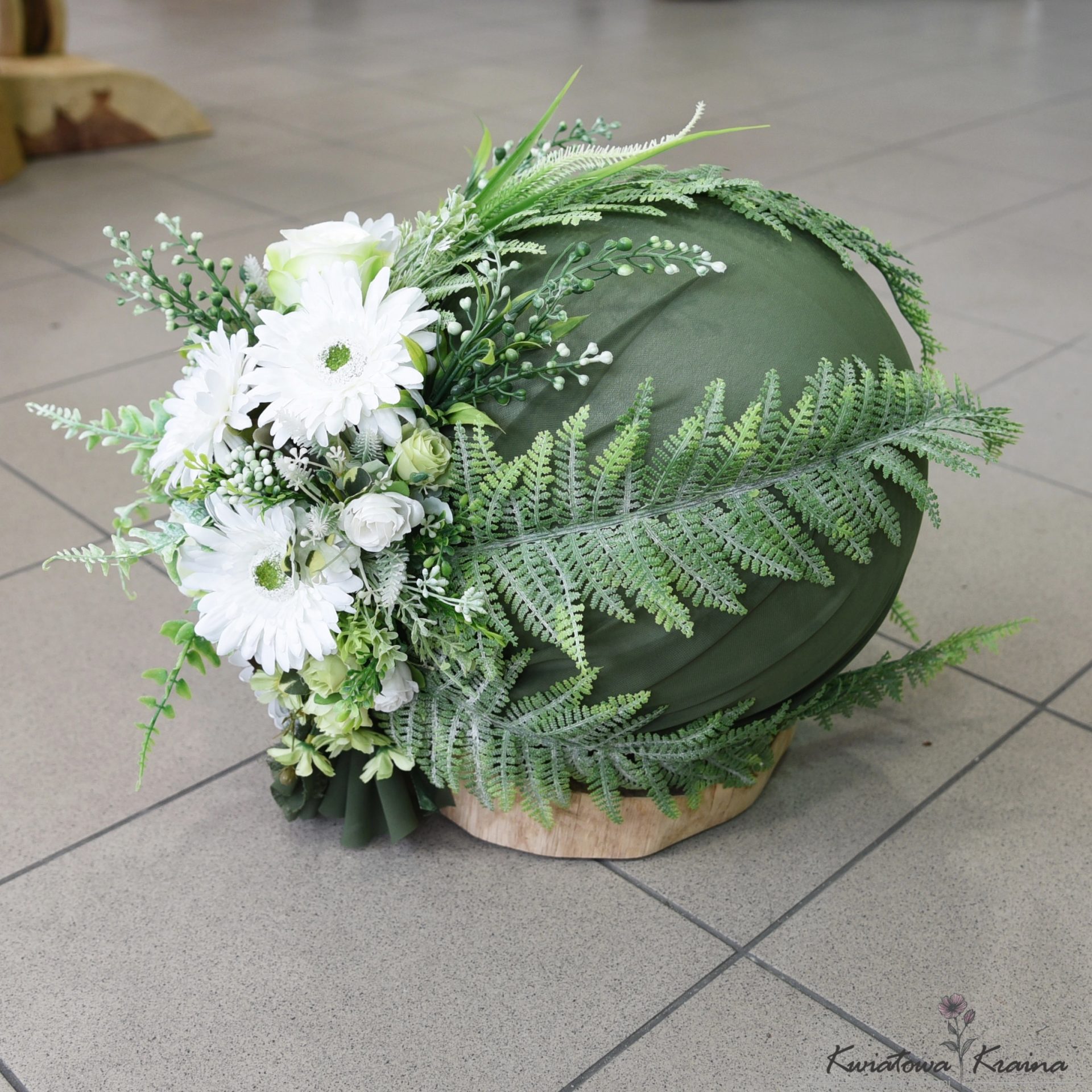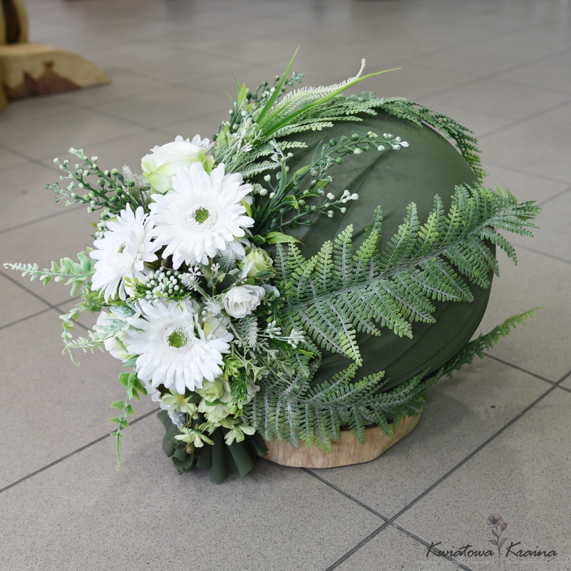 Kompozycja kwiatowa z kulą, którą delikatnie oplatają liście paproci. Aplikacja kwiatowa w stonowanych jasnych kolorach pięknie współgra z całością. Bardzo gustowna i oryginalna dekoracja nagrobna. Tylko odbiór osobisty