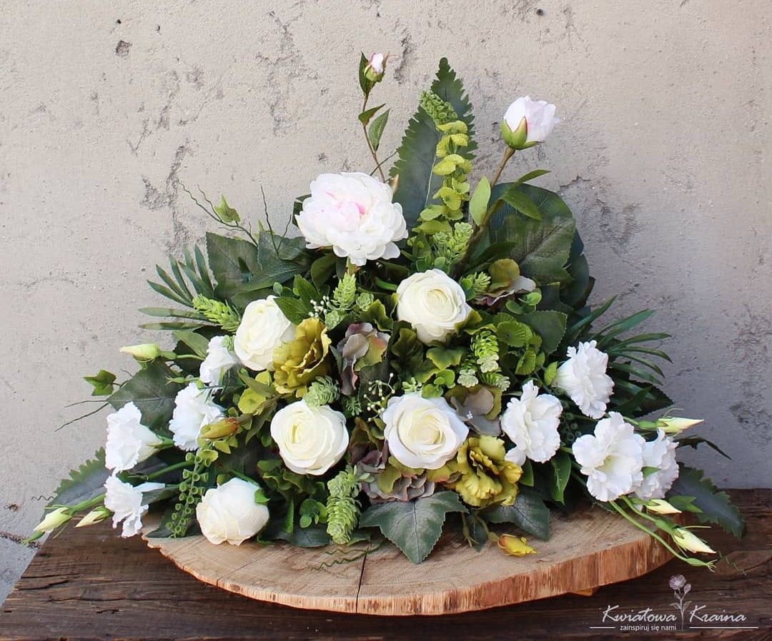Efektowne połączenie kwiatów w jasnej tonacji wraz z zielenią liści i gałązek. Wyjątkowość tej kompozycji podkreśla drewniany plaster który stanowi jej bazę. Bardzo przyjemna dla oka. Tylko odbiór osobistySpecyfikacja