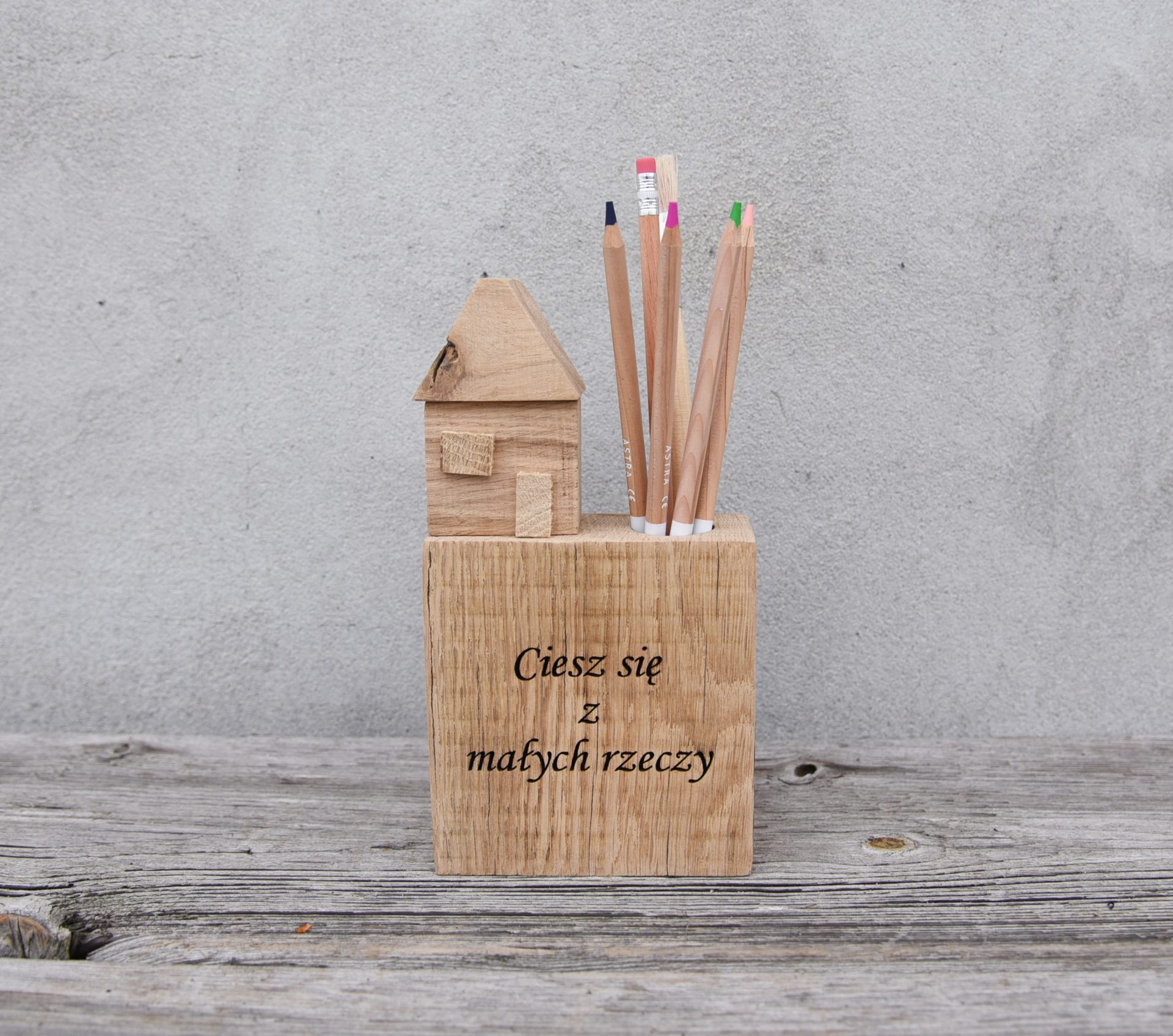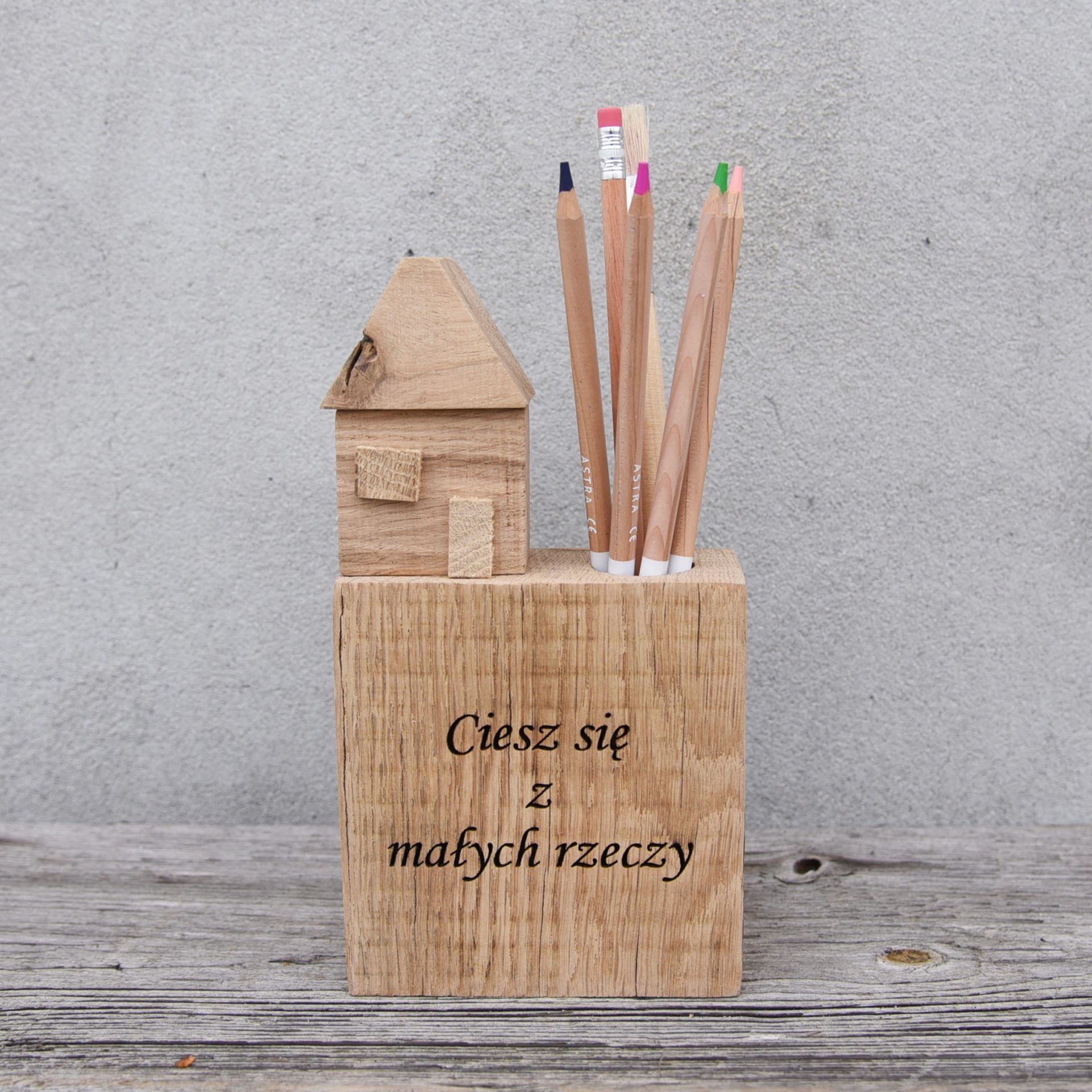 Piórnik z drewna Sentencja-Grawer Upominek Prezent Domek Ciesz się z małych rzeczy