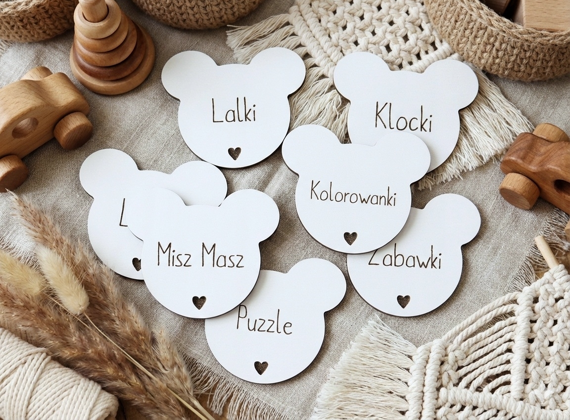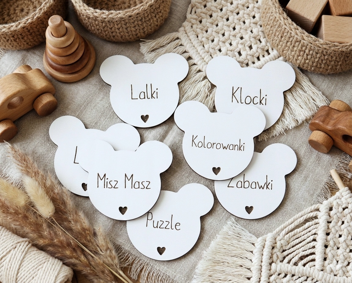 Plakietki tabliczki na szuflady na pudełka organizery grawer dziecko misio