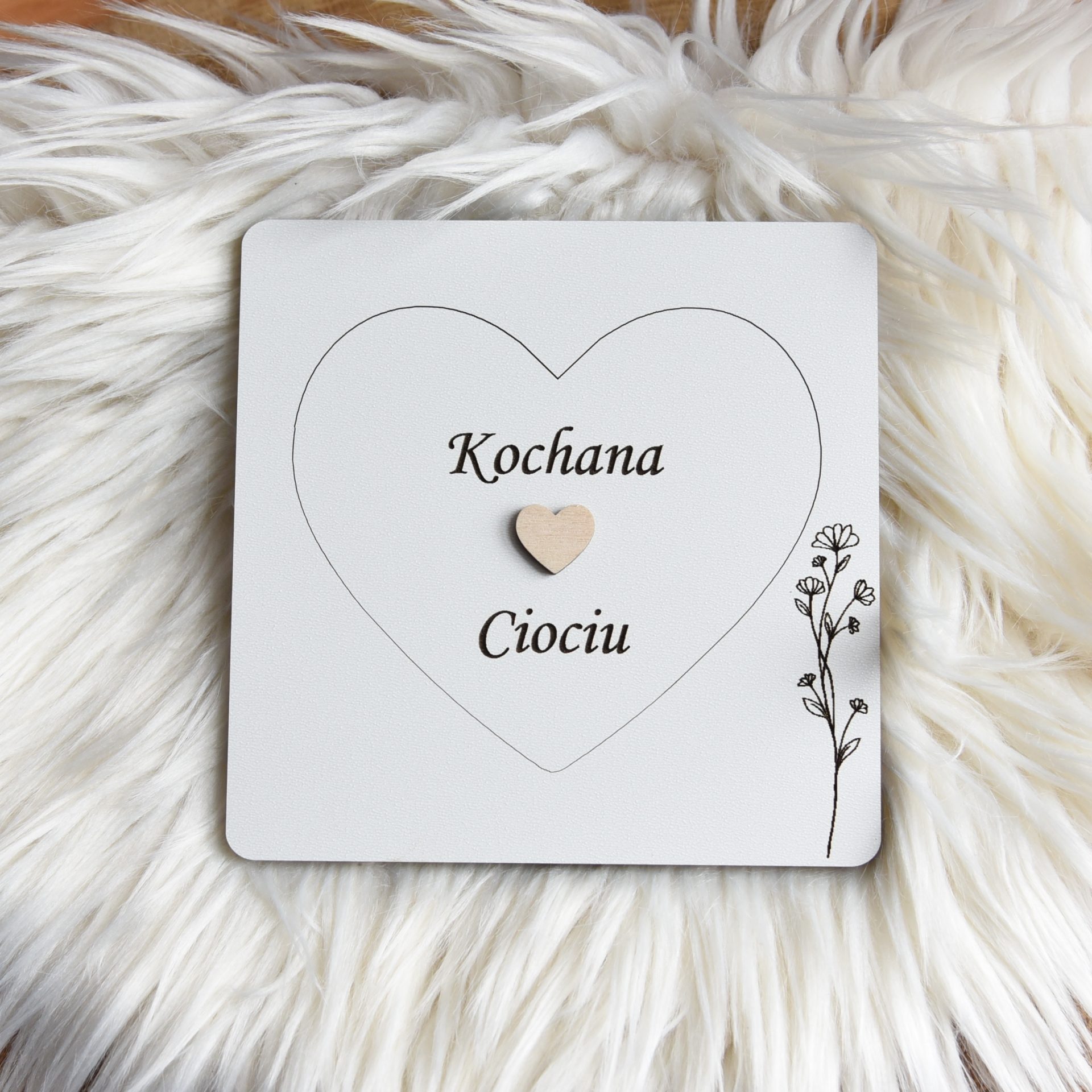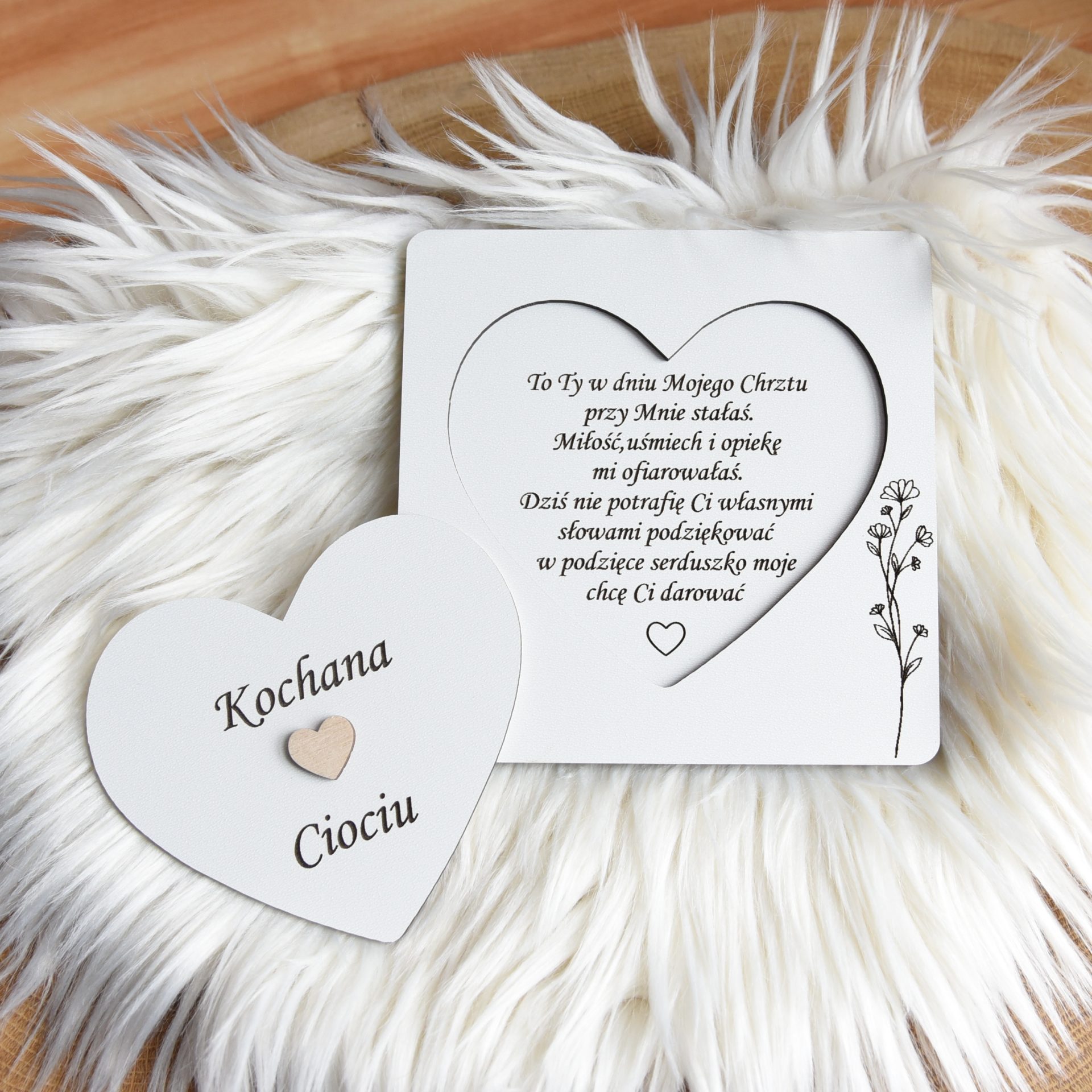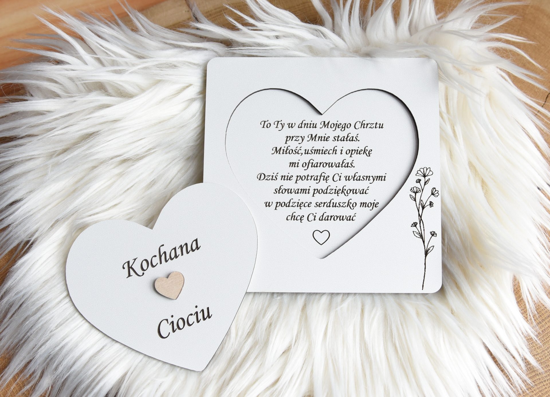 Podziękowanie dla Cioci na Chrzest Święty – personalizowana tabliczka z serduszkiem Szukasz wyjątkowego prezentu, który wzruszy i pozostanie pamiątką na lata? Ta elegancka tabliczka z wyjmowanym serduszkiem to piękny sposób, by podziękować ukochanej Cioci za obecność i wsparcie w dniu Chrztu Świętego. OPIS PRODUKTU:- Materiał: wysokiej jakości płyta HDF, dwustronnie biała