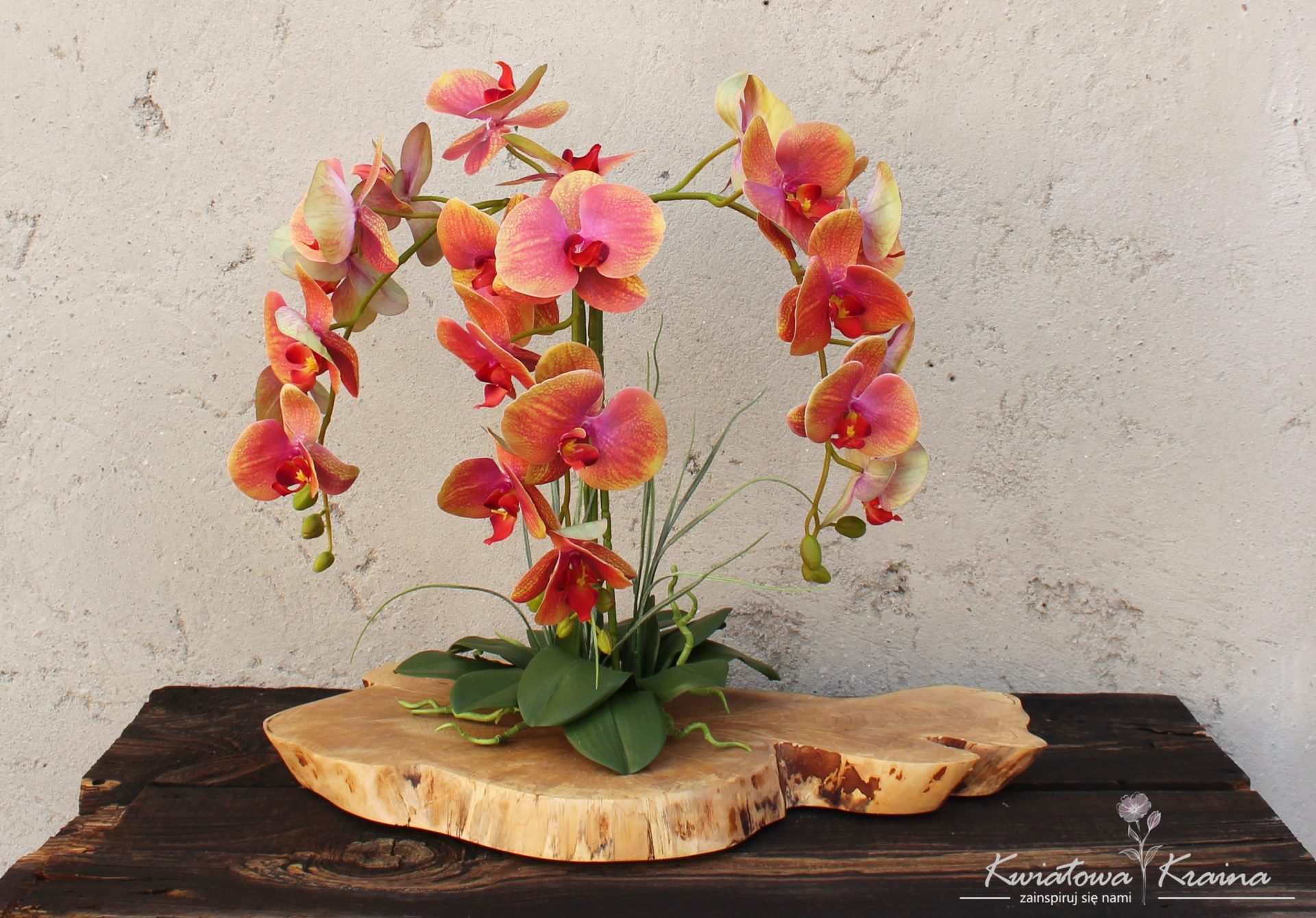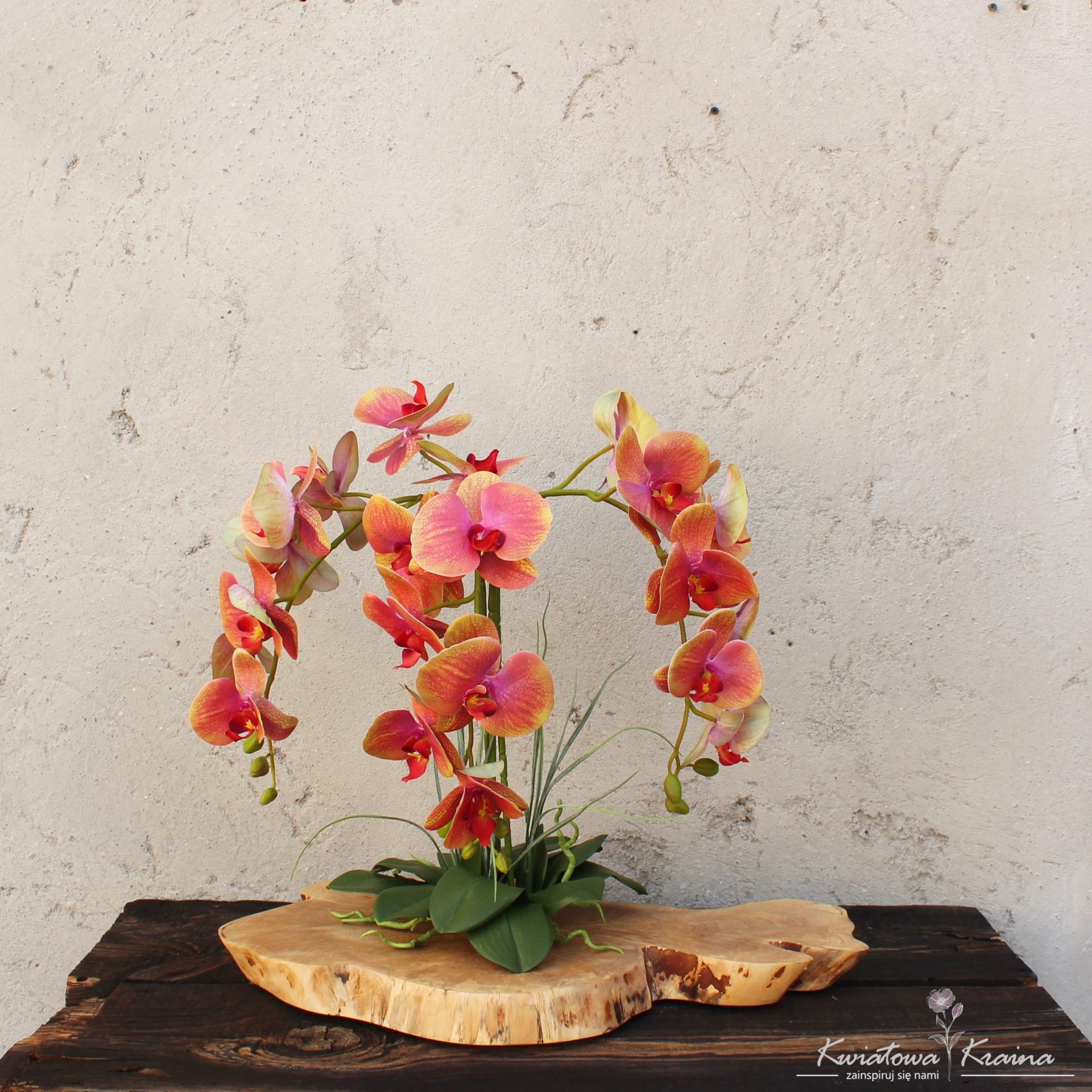 Stylowa a zarazem niezwykle oryginalna kompozycja z użyciem storczyków osadzonych na starannie wyszlifowanym plastrze drewna o niepowtarzalnym kształcie i słojach. Całość wygląda bardzo naturalnie. Poprzez użycie kwiatów najwyższej jakości niejedna osoba mogłaby pomylić je z prawdziwymi.