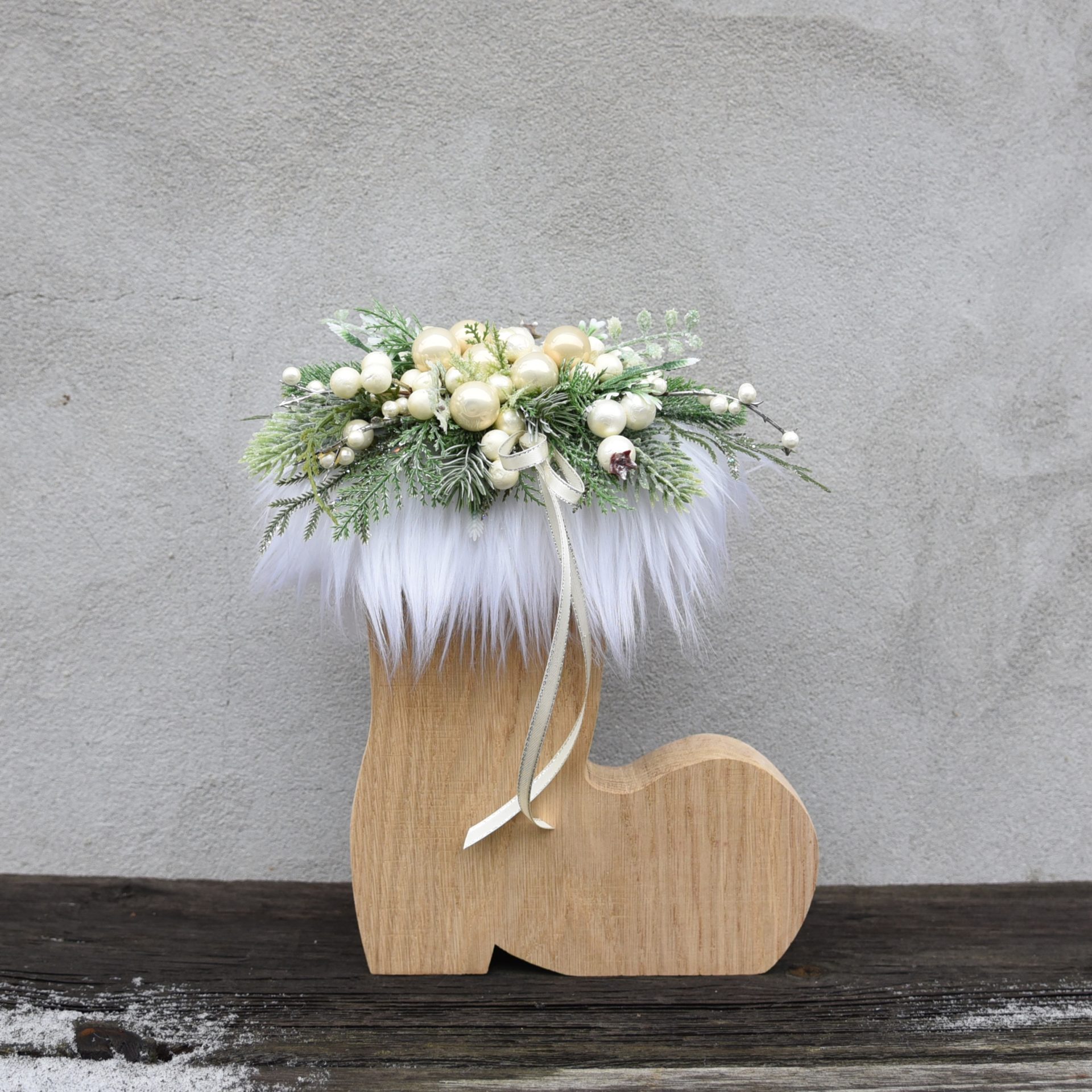 Magia Świąt w Twoim Domu – Stroik Bożonarodzeniowy w Kształcie Buta z Futerkiem Dodaj odrobinę elegancji i uroku do swojego świątecznego wystroju dzięki unikalnemu stroikowi bożonarodzeniowemu w kształcie buta. Wykonany z dbałością o najdrobniejsze detale, ten niezwykły element dekoracyjny przyciąga wzrok i wprowadza do wnętrza wyjątkowy, świąteczny nastrój. Cechy produktu: Niepowtarzalny design – Drewniany but ozdobiony miękkim, białym futerkiem to połączenie subtelnej klasyki z nowoczesnym stylem. Idealnie wpisuje się w trendy glamour i pastelowych aranżacji. Wszechstronne zastosowanie – Może pełnić funkcję stroika na stół, ozdoby kominka czy efektownego dodatku na parapet. Ręczne wykonanie – Każdy element został starannie dopracowany, co czyni ten stroik wyjątkowym i jedynym w swoim rodzaju. Wysoka jakość – Użyte materiały gwarantują trwałość, dzięki czemu dekoracja będzie cieszyć Twoje oko przez wiele sezonów. Spraw, by Twój dom emanował wyjątkowym świątecznym blaskiem. Stroik w kształcie buta to idealny wybór zarówno dla miłośników klasyki, jak i tych, którzy cenią nowoczesne, nietuzinkowe dodatki. Świetnie sprawdzi się również jako prezent – elegancki, stylowy i pełen świątecznego wdzięku. Zamów już dziś i zaproś do swojego domu atmosferę pełną magii Świąt! 🎅✨ Wymiary: 28cm x 22cm x 10cmSpecyfikacja