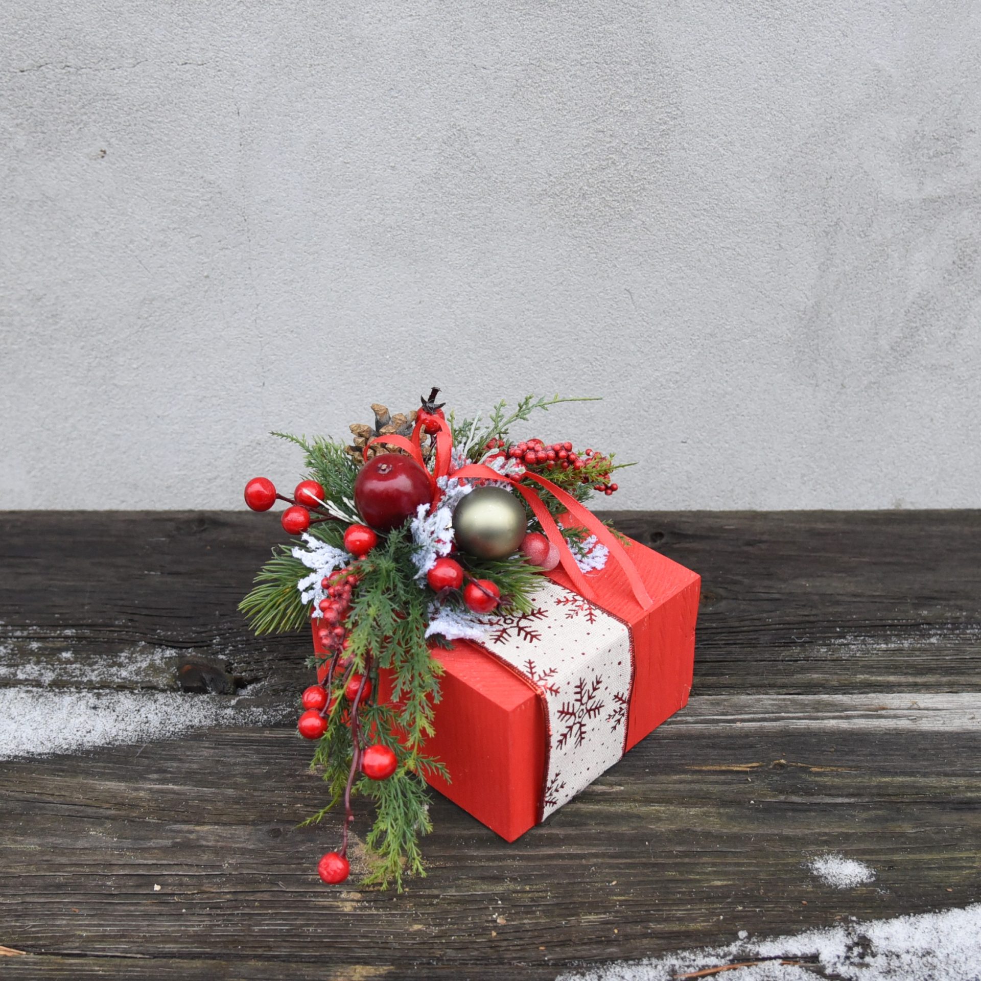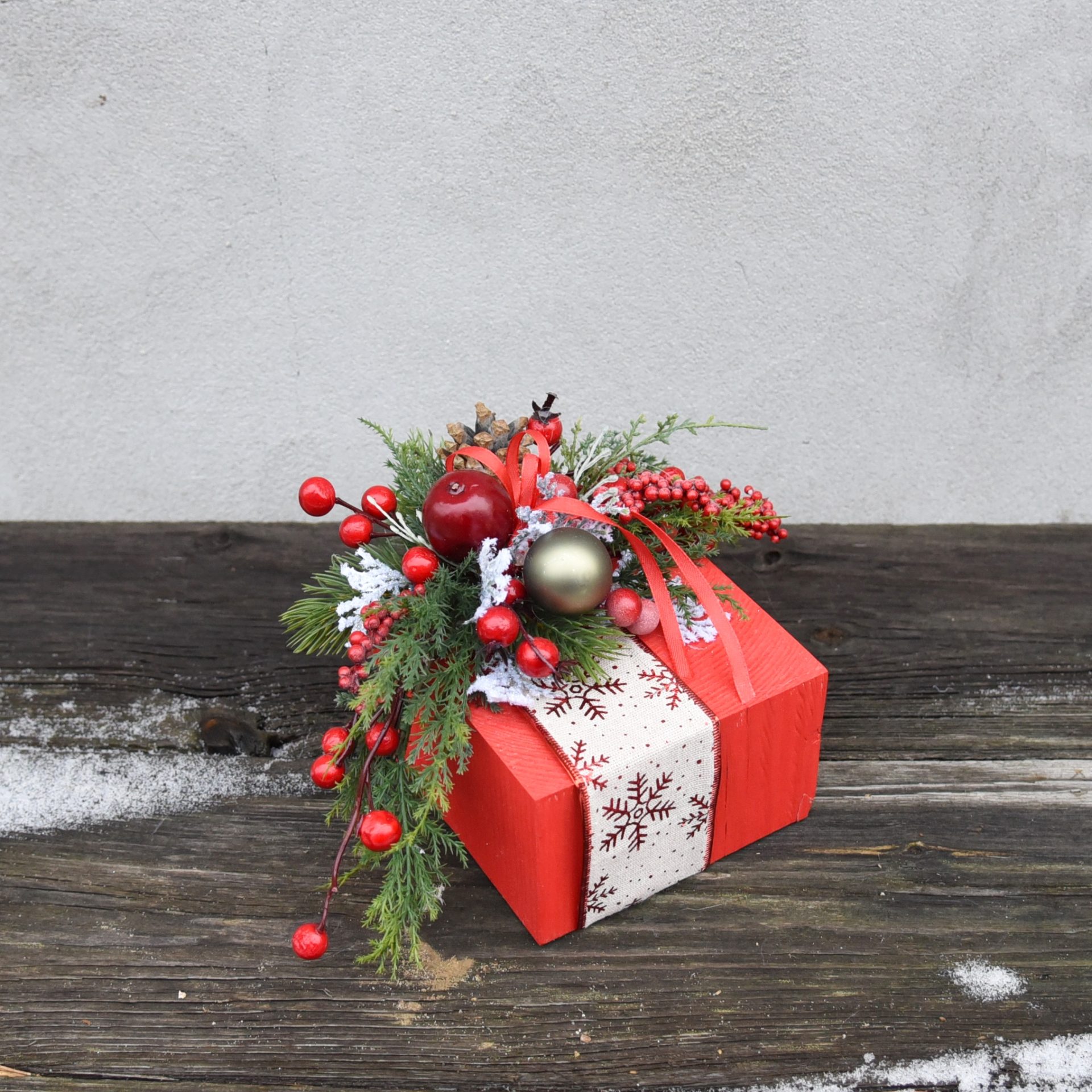 Wyjątkowy Blask Świąt – Stroik w Kształcie Prezentu z Aplikacją Zimową w kolorze czerwonym Podaruj swojemu wnętrzu odrobinę świątecznej magii dzięki eleganckiemu stroikowi w kształcie prezentu. Zimowe aplikacje i subtelne detale czynią go niezwykłą dekoracją. Cechy produktu: Oryginalny design – Stroik w kształcie prezentu to symbol świątecznej radości, idealny do stworzenia nastrojowej atmosfery w każdym wnętrzu. � Zimowa aplikacja – Delikatne zdobienia podkreślają świąteczny charakter stroika. Wysoka jakość wykonania – Stroik został wykonany z trwałych materiałów z dbałością o detale, dzięki czemu będzie piękną ozdobą przez wiele sezonów. Uniwersalność – Doskonale nadaje się na stół, komodę, parapet czy jako dekoracja kominka. Pasuje zarówno do nowoczesnych, jak i klasycznych aranżacji wnętrz. Pomysł na prezent – Stroik w kształcie prezentu to również świetny upominek dla bliskich, który wnosi ciepło i świąteczny nastrój. Wprowadź do swojego domu ciepło i wyjątkowy blask Świąt. Stroik w kształcie prezentu to dekoracja, która przyciąga uwagę i tworzy niepowtarzalny klimat. Zamów już dziś i spraw, by Twoje Święta były jeszcze piękniejsze! 🎁🕯️✨ Wymiary : 14cm x 13.5cm x 15cm szerokość licząc wystające gałązki ok.29cmSpecyfikacja