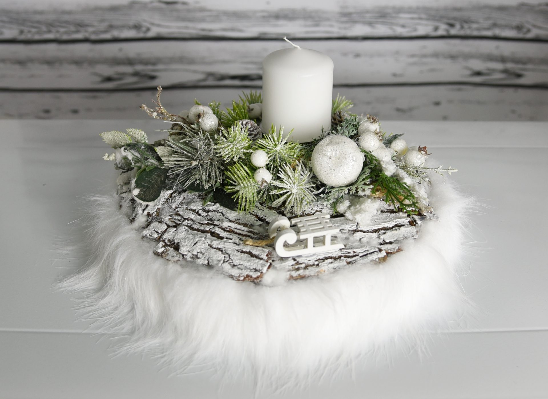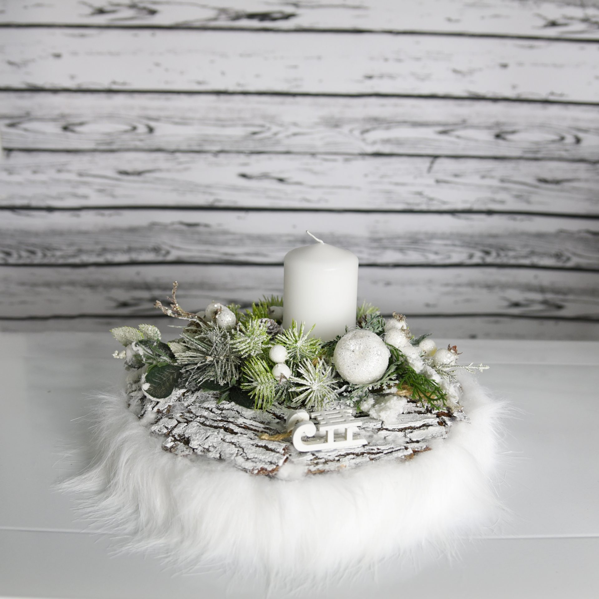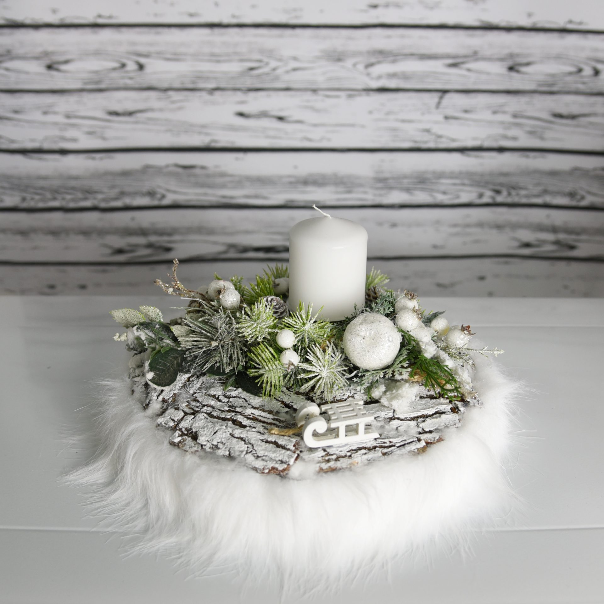 Piękny oryginalny, świąteczny stroik udekoruje każde wnętrze wprowadzając zimowy świąteczny klimat. Kompozycja składa się ze starannie wyselekcjonowanych dodatków najwyższej jakości, które będą cieszyły oko przez wiele lat. Białe aplikacje z kuleczkami na zielonych ośnieżonych gałązkach z jabłuszkiem i zimowa figurka sanek otoczone białym milutkim w dotyku futerkiem. Całość dopełnia biała świeca. Może stanowić wyszukany prezent dla tych, którzy gustują w eleganckich, unikalnych dekoracjach w domu.Specyfikacja