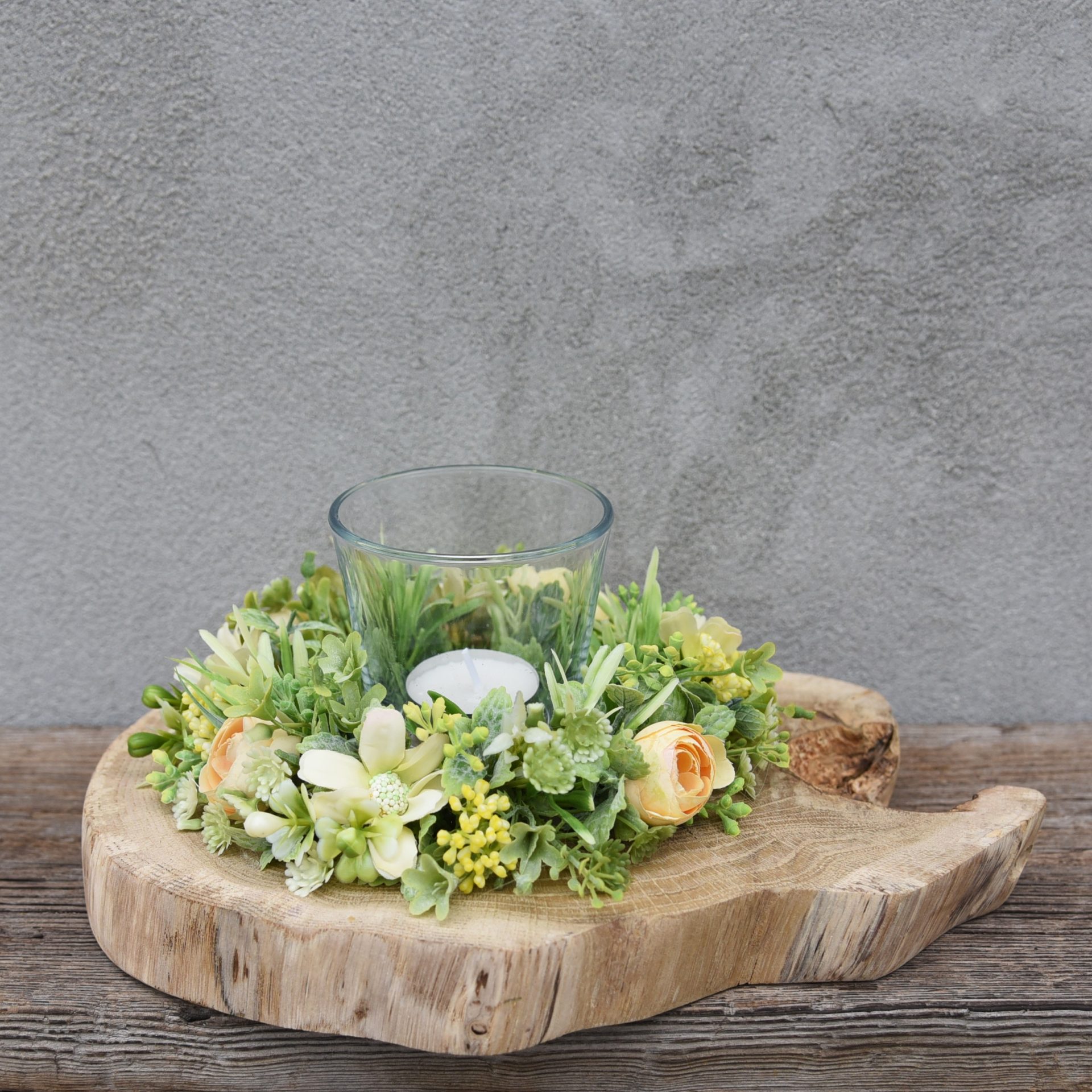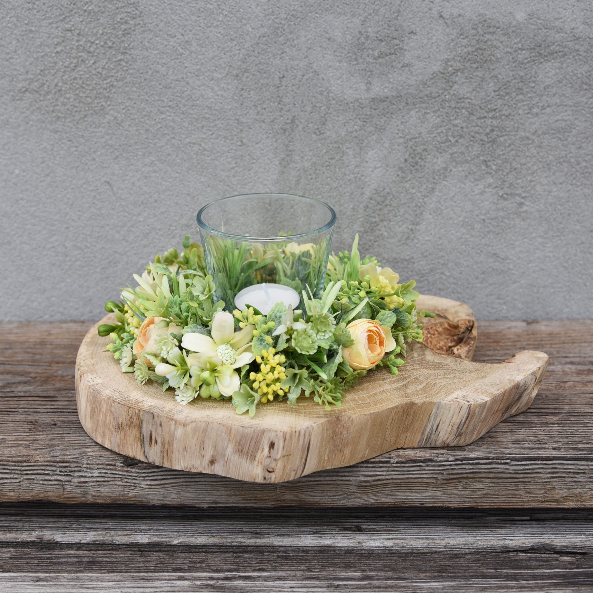 Świecznik na dębowym plastrze drewna z aplikacją kwiatową w odcieniu żółci i zieleni. W środku znajduje się szklany świecznik na małą świeczkę lub podgrzewacz. Szkło można również zamienić na zwykłą dużą świecę. Dekoracja doskonała na stół, ławę czy komodę. Stroik będzie też pięknym prezentem.Specyfikacja
