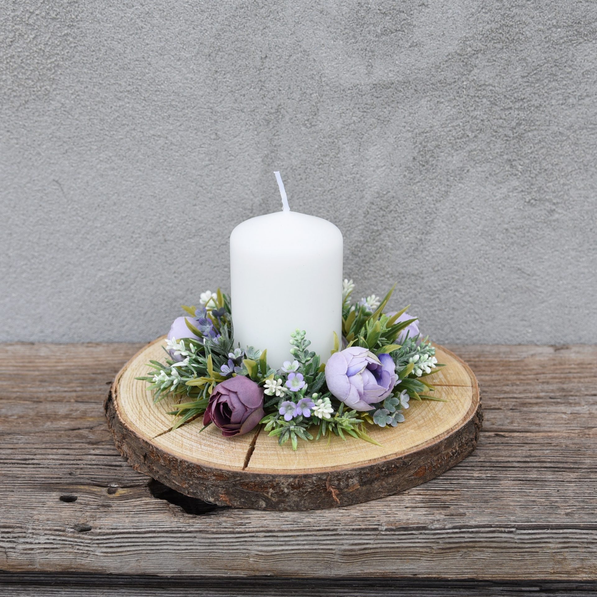 Biała malutka świeca otoczona delikatnymi fioletowymi kwiatuszkami i dodatkami w kolorze zieleni i fioletu. Całość osadzona na starannie wyszlifowanym plastrze drewna. Dekoracja doskonała na stół, ławę czy komodę. Stroik będzie też pięknym prezentem.
