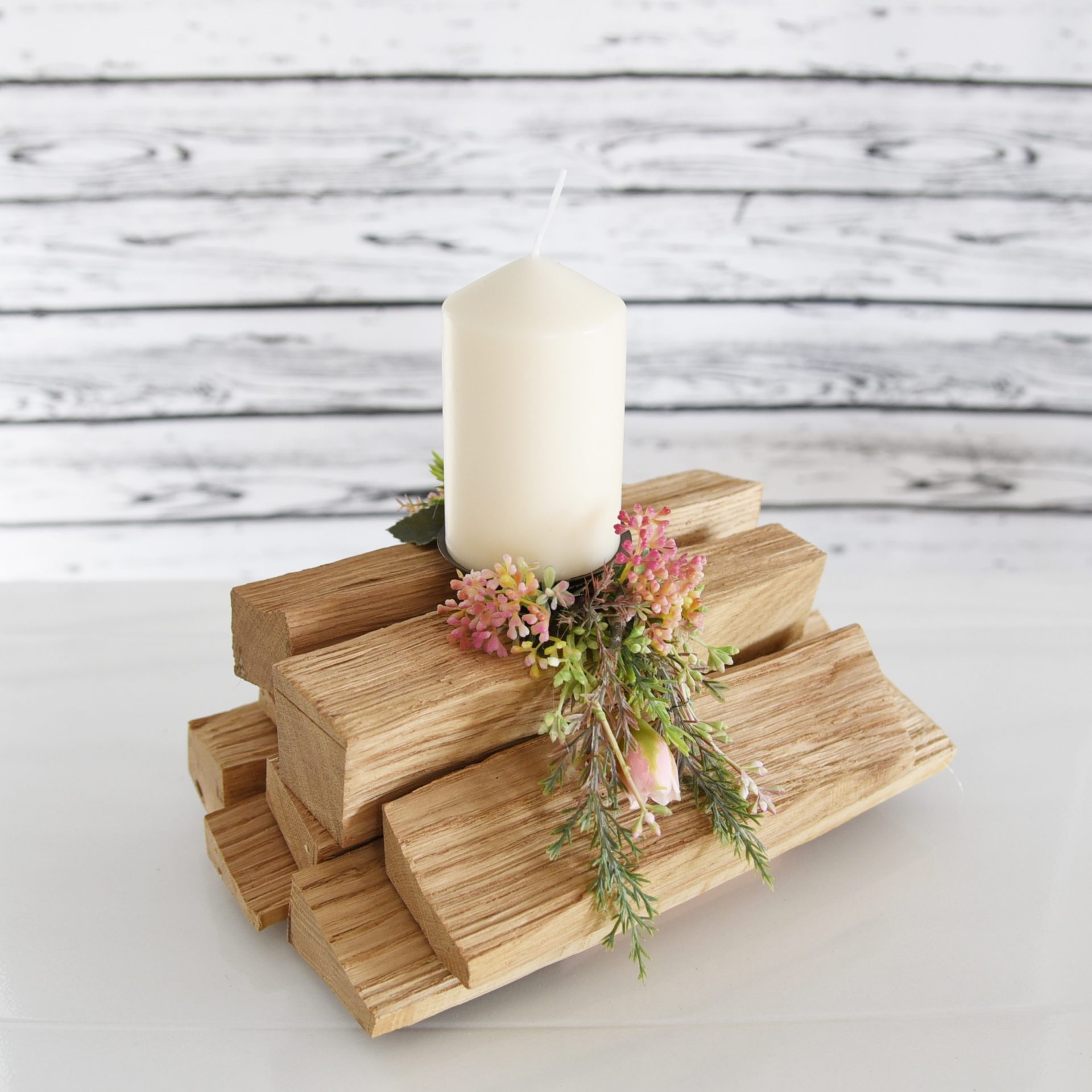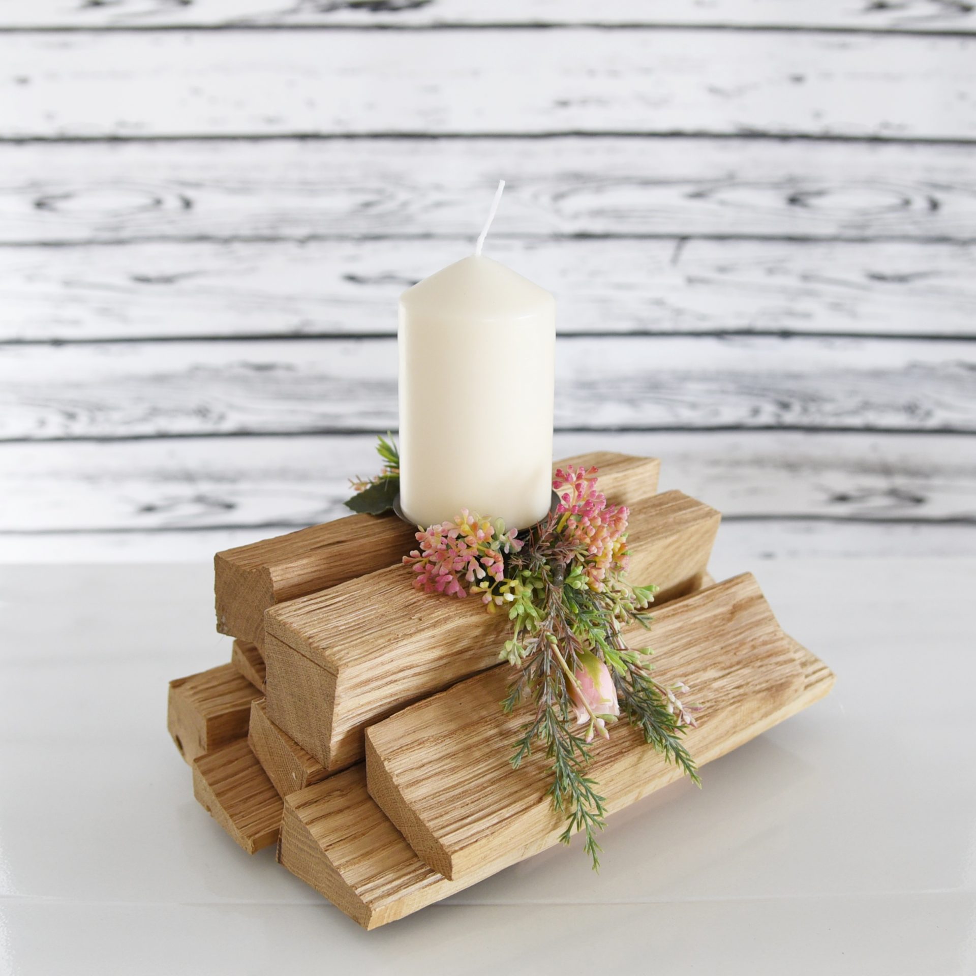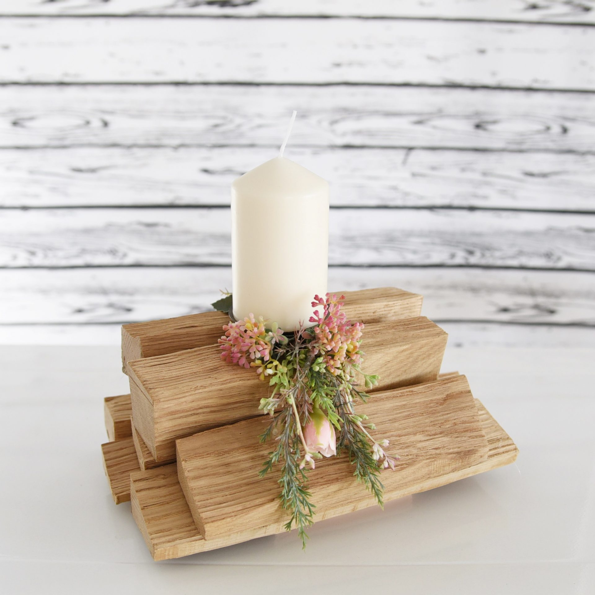 Bardzo oryginalny w swojej formie świecznik ze sztabek drewna ułożonych jedna na drugą. Uroku tej dekoracji dodaje delikatna aplikacja kwiatowa w kolorze różu. Całość dopełnia świeca.