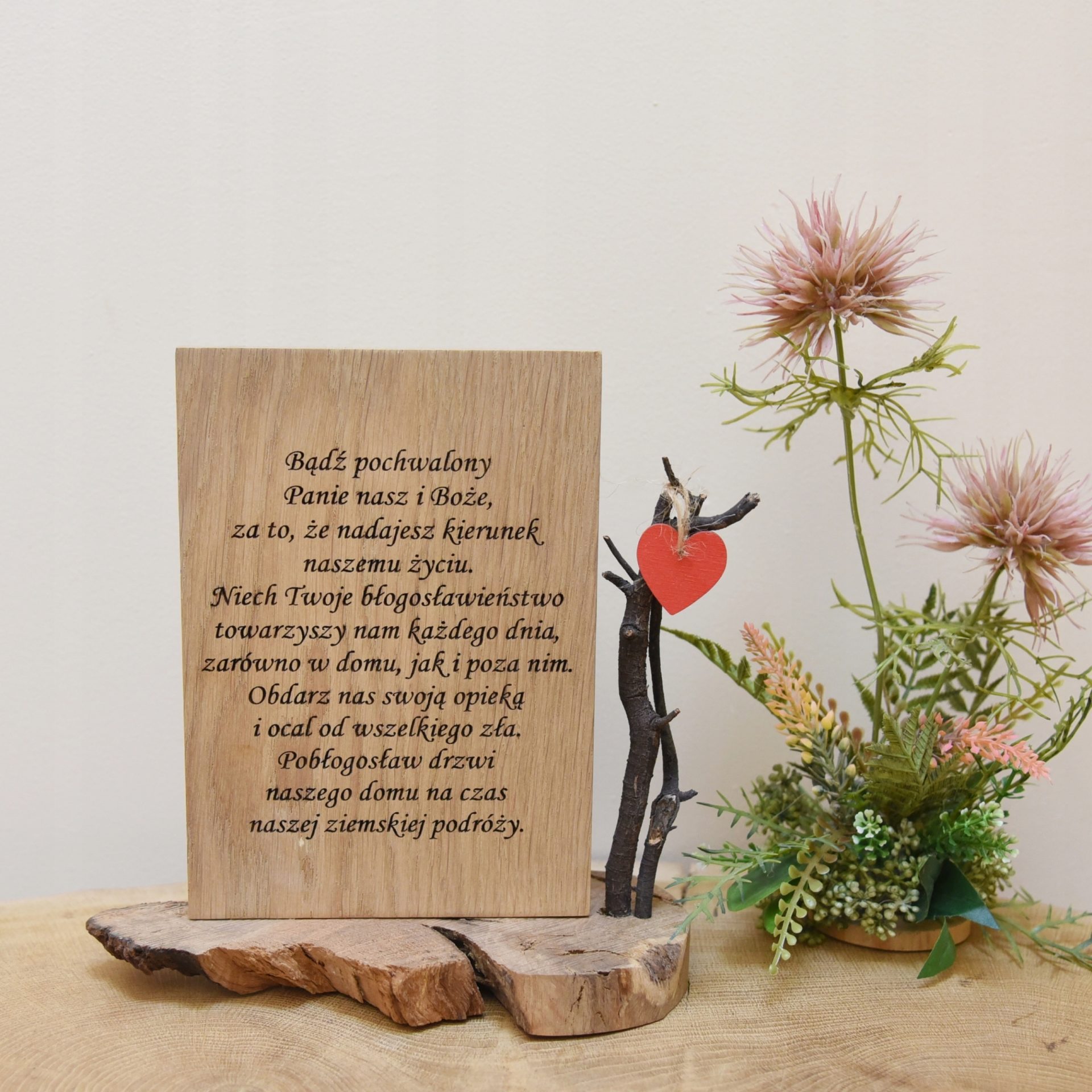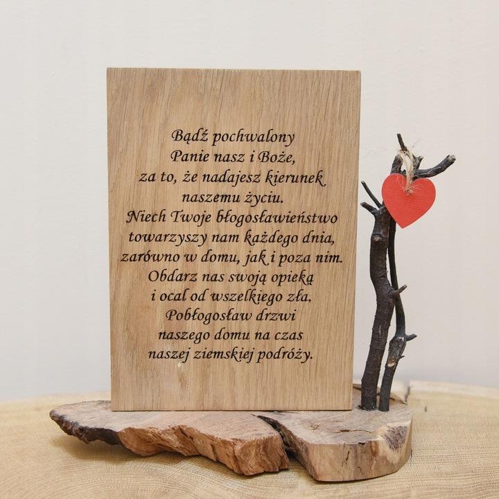 Drewniana Tabliczka z Grawerem – "Bądź pochwalony, Panie nasz i Boże..." Podkreśl duchowy charakter swojego domu lub podaruj bliskiej osobie wyjątkowy symbol wiary! Naturalne drewno | Precyzyjny grawer | Ponadczasowe przesłanie Nasza drewniana tabliczka z grawerem to piękna ozdoba i duchowe przesłanie w jednym. Wykonana z wysokiej jakości drewna, z elegancko wygrawerowanymi słowami: „Bądź pochwalony, Panie nasz i Boże, za to, że nadajesz kierunek naszemu życiu.” ✅ Unikalny design – starannie wykonany grawer podkreśla wyjątkowy charakter tabliczki. ✅ Trwałość i solidność – naturalne drewno zapewnia długowieczność i piękny wygląd. ✅ Idealny prezent – dla bliskich, na różne okazje: chrzest, bierzmowanie, ślub czy rocznicę. ✅ Łatwy montaż – możliwość postawienia na półce. Stwórz w swoim domu atmosferę refleksji i wdzięczności. Zamów już dziś! 🙏✨ UWAGA! OFERTA DOTYCZY TABLICZKI BEZ DEKORACJI KWIATOWEJ! UWAGA! PONIEWAŻ PROWADZIMY RÓWNIEŻ SPRZEDAŻ STACJONARNĄ BARDZO PROSIMY O WIADOMOŚĆ PRZED ZŁOŻENIEM ZAMÓWIENIA Wymiary: długość 21cm x szerokość 10 cm x wysokość 22 cm Kolorystyka produktu może minimalnie różnić się od prezentowanej w zależności od ustawień Państwa ekranu, monitora. Inne produkty znajdziesz na moich pozostałych aukcjach.Specyfikacja