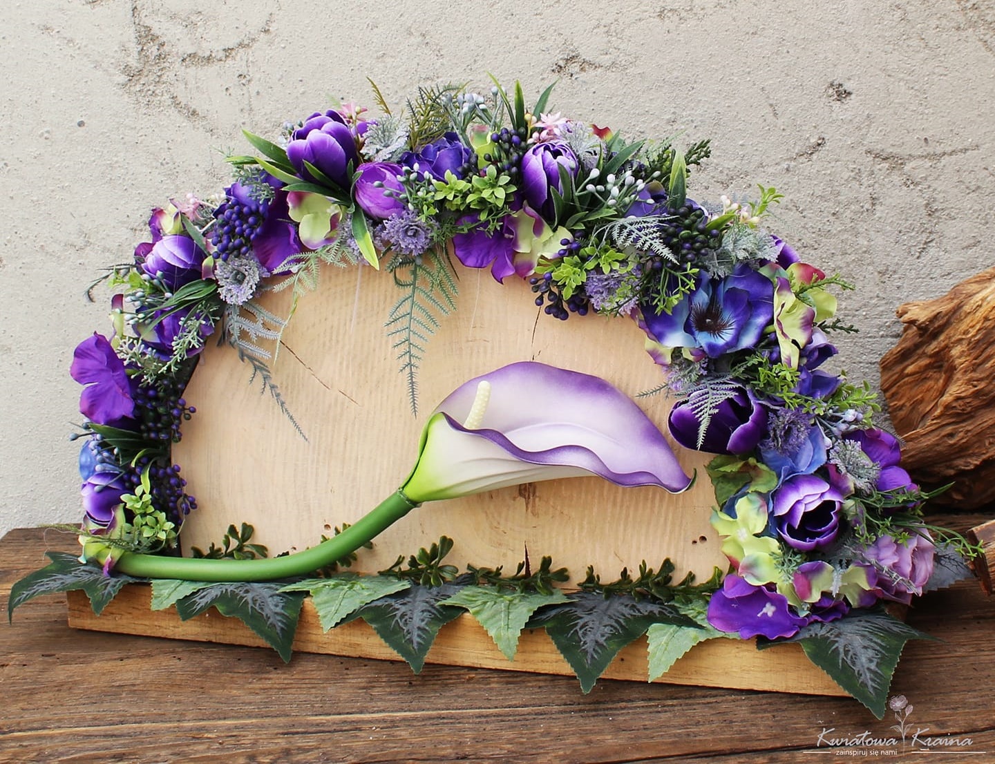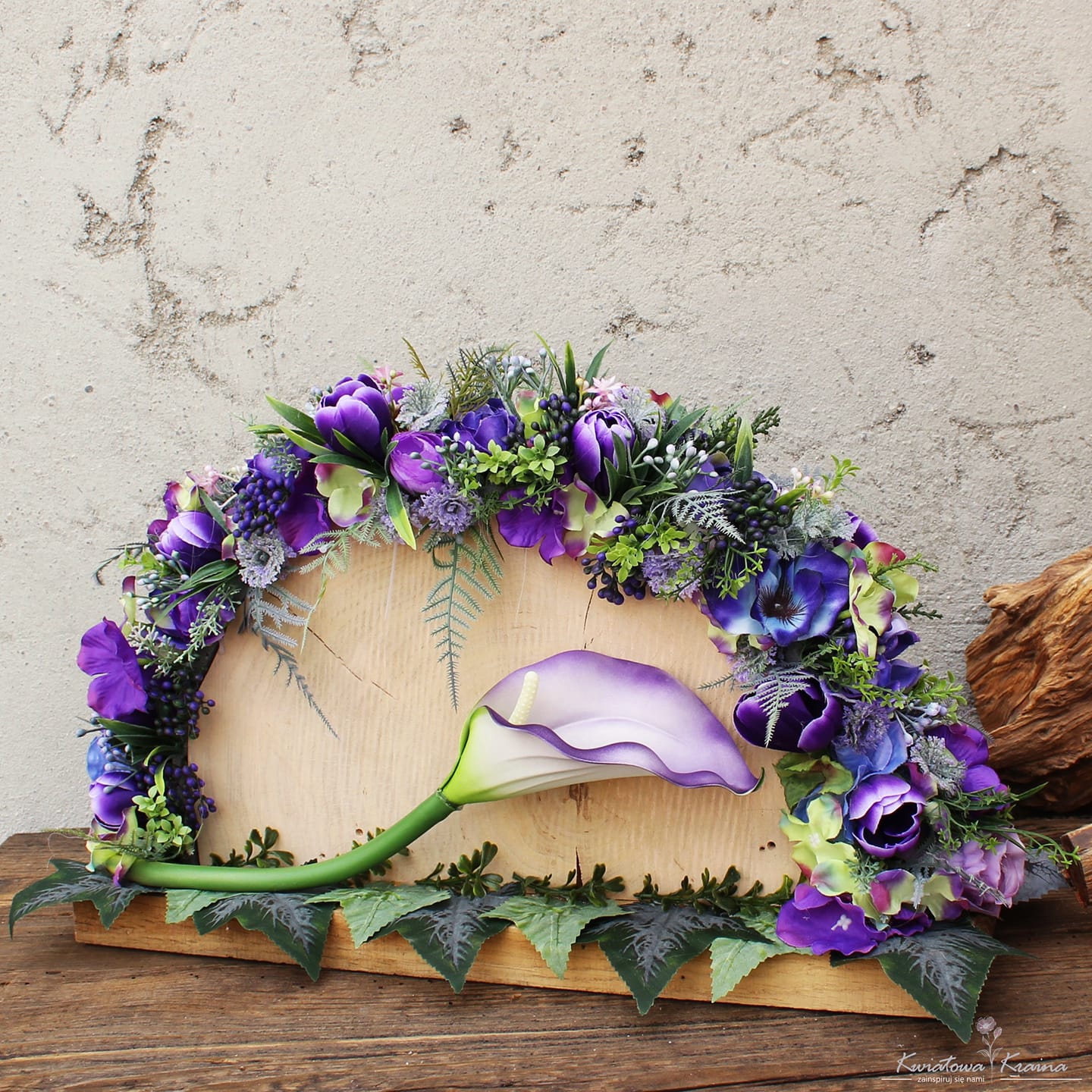 Wykonany z najlepszej jakości kwiatów w odcieniach fioletu. Niezwykle elegancki i oryginalny. Wyjątkowość tej kompozycji podkreśla półokrągły element drewna który stanowi bazę. Tylko odbiór osobisty!Specyfikacja