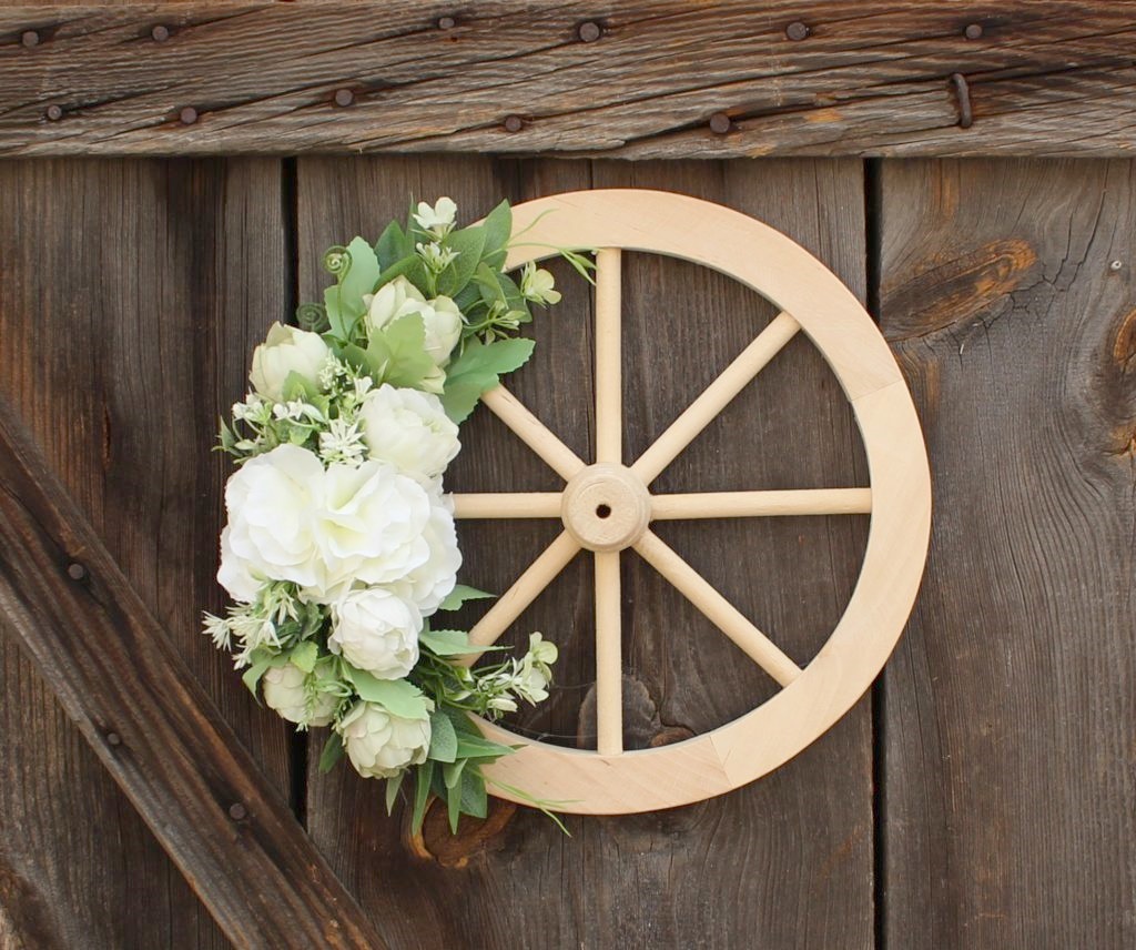 Delikatny wianek na drewnianym kole, które niewątpliwie dodaje wyjątkowego charakteru całości z efektowną aplikacją kwiatową w odcieniach bieli i zieleni z wysokiej jakości kwiatów. Bardzo oryginalna dekoracja na drzwi do Twojego domu. Wianek świetnie zaprezentuje się również powieszony w oknie lub na ścianie dowolnego pomieszczenia.