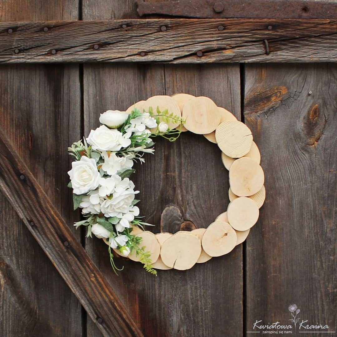 Uroczy wianek z drewnianych talarków z delikatną aplikacją kwiatową w kolorze bieli.
