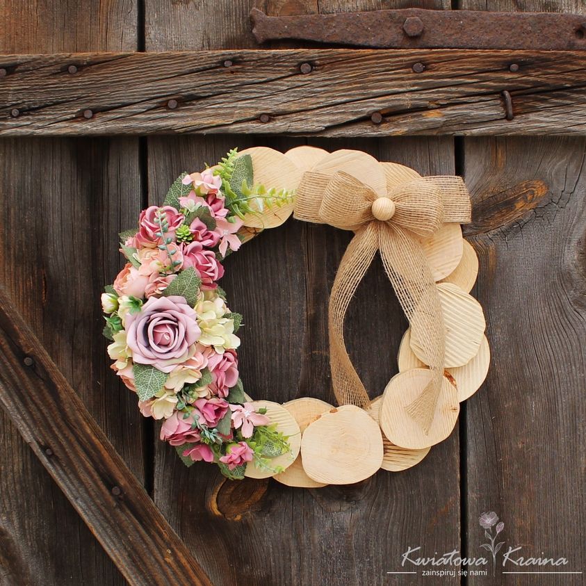 Piękny drewniany wianek to kompozycja wykonana z wysokiej jakości sztucznych kwiatów oraz dodatków. Bazę tej dekoracji stanowią drewniane talarki misternie ułożone w okrąg- co niewątpliwie przyciąga naszą uwagę. Aplikacja kwiatowa w odcieniach różu dopełnia całość. Powieszony na drzwiach, ścianie czy w oknie, będzie się pięknie prezentował ciesząc oczy domowników. Może być również nietuzinkowym prezentem dla naszych bliskich.
